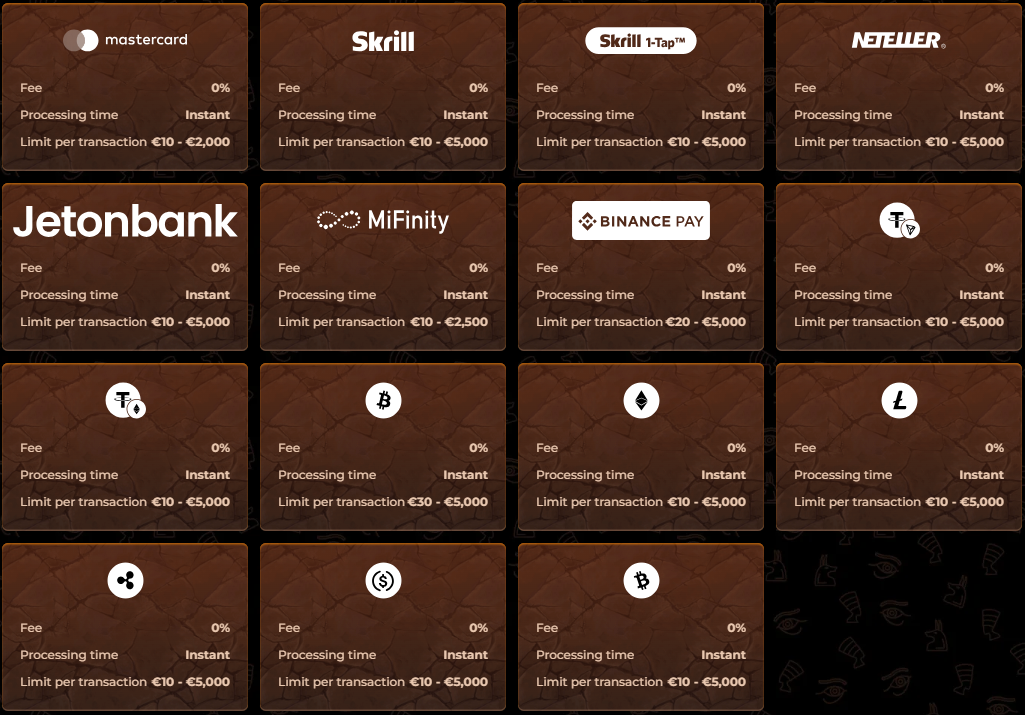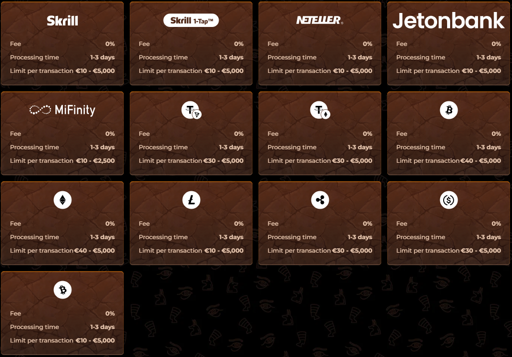 Amunra Casino supports a variety of payment methods, including Mastercard, Skrill, Neteller, and Bitcoin.