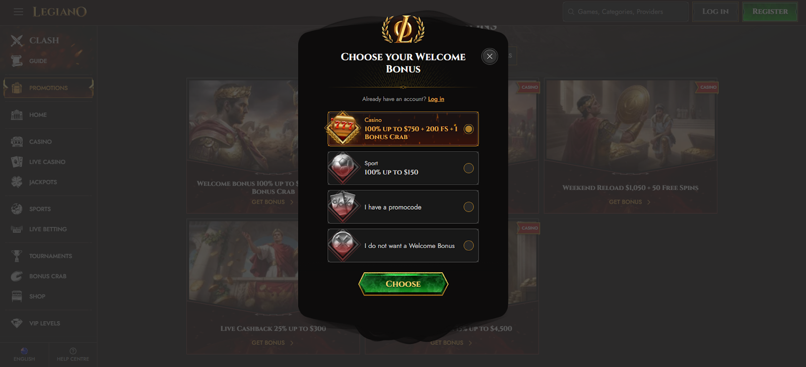 Sign Up or Welcome Package at Legiano Casino